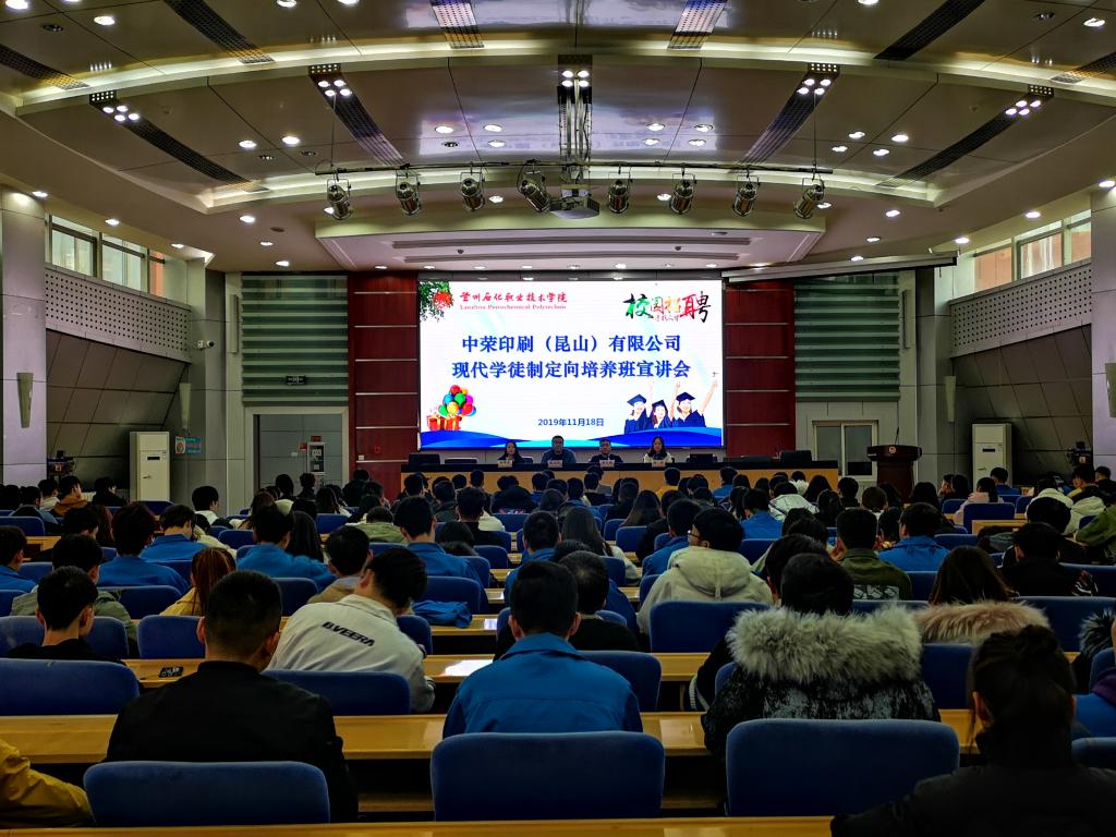 11月18日下午,中荣印刷集团股份有限公司学习与发展总监、国家现代学徒制试点项目特聘专家黄冬毅,中荣集团中山公司、昆山公司人力资源部负责人一行三人来我校开展现代学徒制定向培养宣讲,宣讲会在多功能报告厅举行,印刷出版工程学院2018级全体学生参加了宣讲会。
