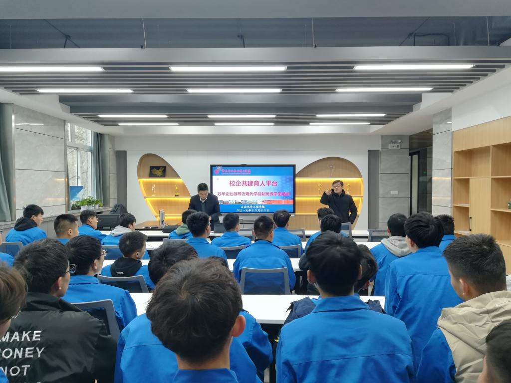 会后,操礼刚经理为2019级万华现代学徒制班作关于公司企业文化方面的教育,他从公司发展历程和中长期发展规划、企业的文化精神,公司发展的方向理念等方面进行了介绍。随后,他与学生互动交流,就各位学生(学徒)关心的问题做出了耐心的回答。