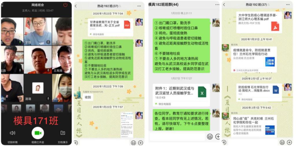 担任班主任的教工党员们认真负责,定期召开云班会传达学校相关要求,掌握学生行踪,建立学生健康档案,在班级群中发送正能量案例,及时为学生答疑解惑,做好疫情期间学生心理疏导工作。