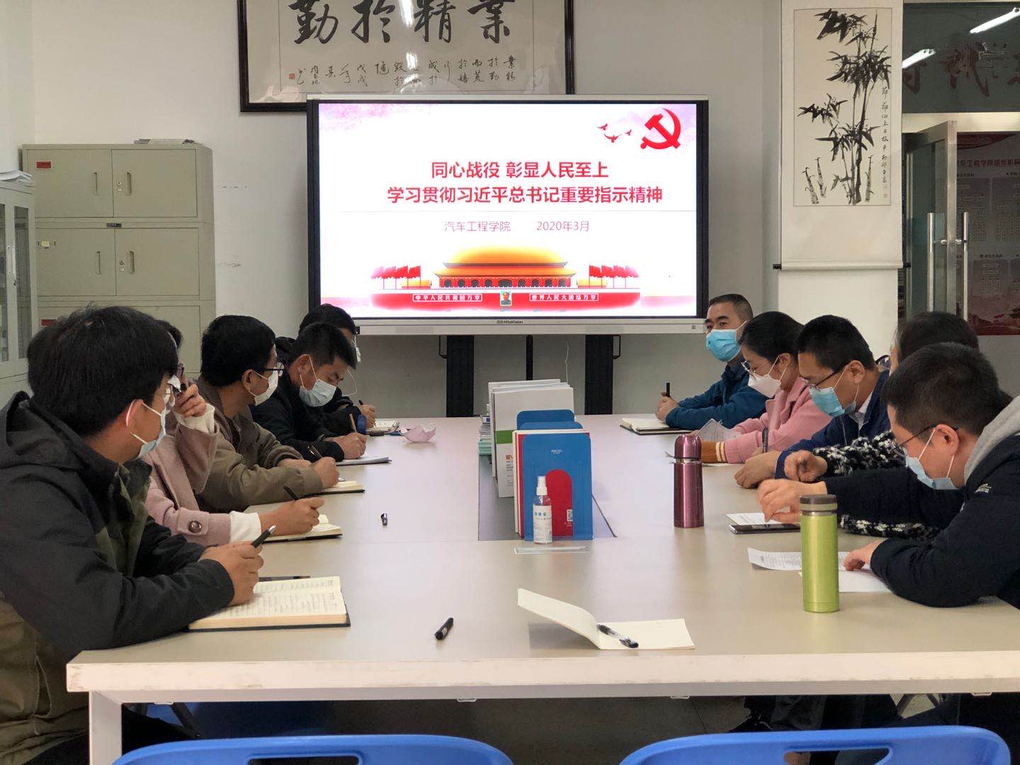 3月23日下午,汽车工程学院党总支采用“线上+线下”相结合的方式召开了题为“同心战役 彰显人民至上”学习贯彻习近平总书记重要指示精神的党员大会,传达学习习近平总书记在新冠肺炎疫情防控工作时的重要讲话精神。全体教工党员参加了会议。