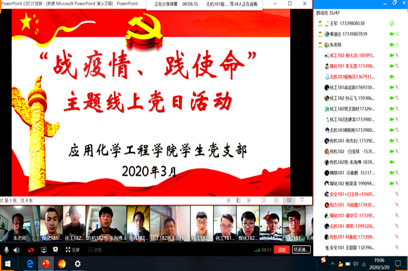 3月22日晚,应用化学工程学院学生党支部通过QQ直播平台方式,开展了“战疫情、践使命”线上主题党日活动。全体学生党员在线参加了会议。
