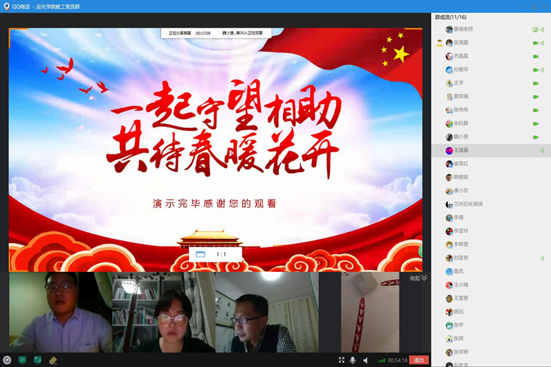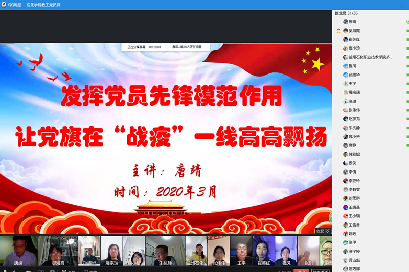 3月26日下午,应化学院教工党支部书记通过在线视频的形式,以“发挥党员先锋模范作用,让党旗在‘战疫’一线高高飘扬”为主题,给全体教工党员讲授了一堂生动的党课。