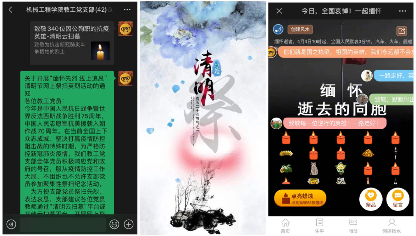 2020年,一场突如其来的疫情给大家的生活蒙上厚厚的阴影。面对严峻的疫情防控,医务人员义无反顾,挺身而出。他们成了逆向而行的孤胆英雄,在生死时速的生命通道上,毅然担起了治病救人,救死扶伤的社会重任。在清明节来临之际,恰逢新冠肺炎疫情防控决战决胜的关键阶段,为表达对抗击新冠肺炎疫情斗争牺牲烈士和逝世同胞的深切哀悼,机械工程学院党总支教工党支部和学生党支部全体党员积极响应党和政府的号召,服从疫情防控工作大局,通过“清明云扫墓”平台,在网上点亮蜡烛、献上花束和思念寄语,开展网上祭扫英烈、致敬抗疫英雄活动,表达对先烈的崇敬之心、感念之情和传承之志。