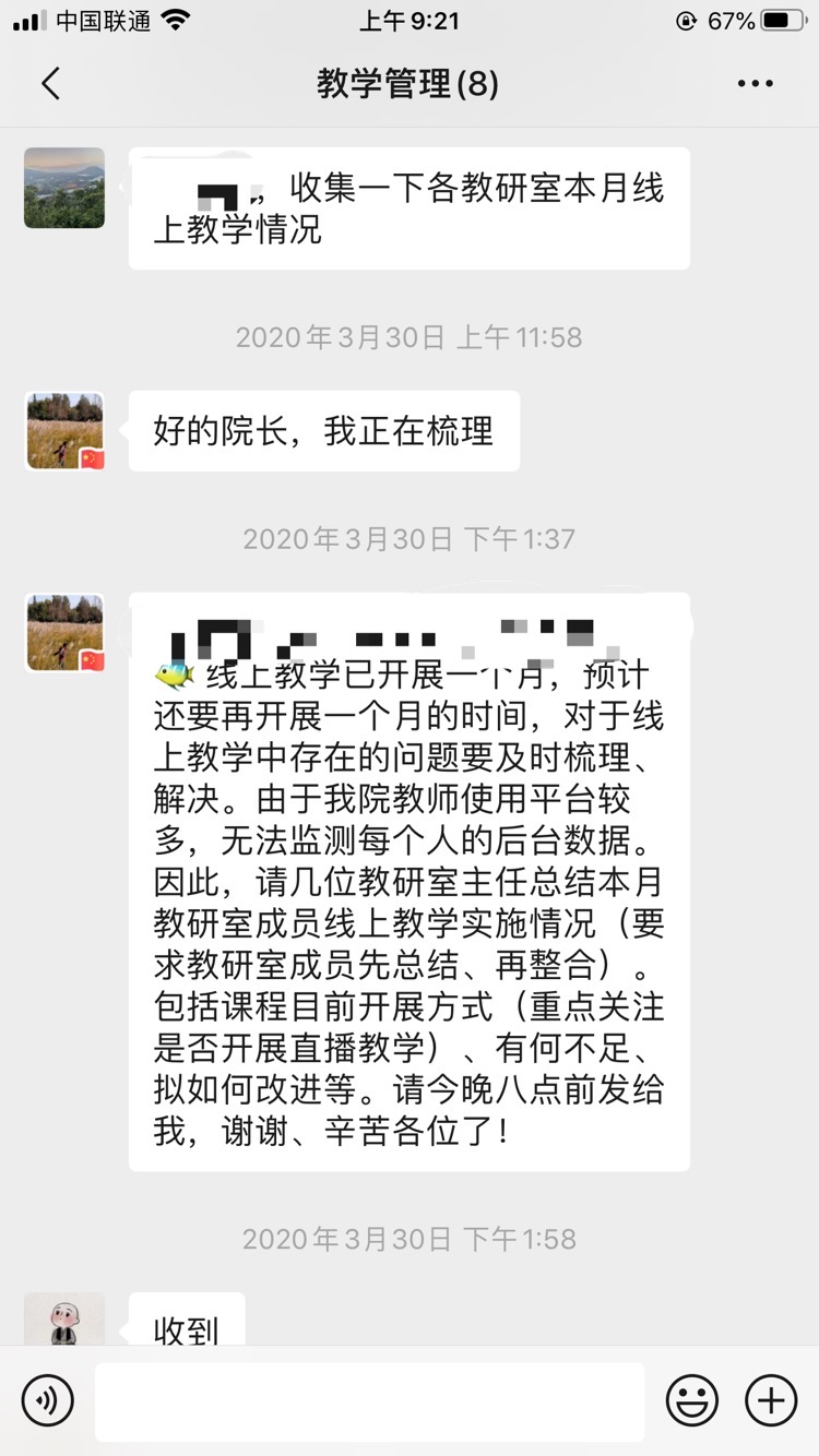 教学监督检查小组由院长挂帅,协同院长助理、教研室主任和教学秘书组成,通过深入网络课堂在线听课,了解授课质量、课堂互动、资源利用、平台使用等情况,及时收集师生在线上教学中遇到的各类实际问题,进行线上集中讨论交流,向教师学生提供合理化建议,多元互补,提升线上教学质量。各位教师以教学质量为中心,做到课前备课全掌握、课中过程有监督、课后总结齐分享。