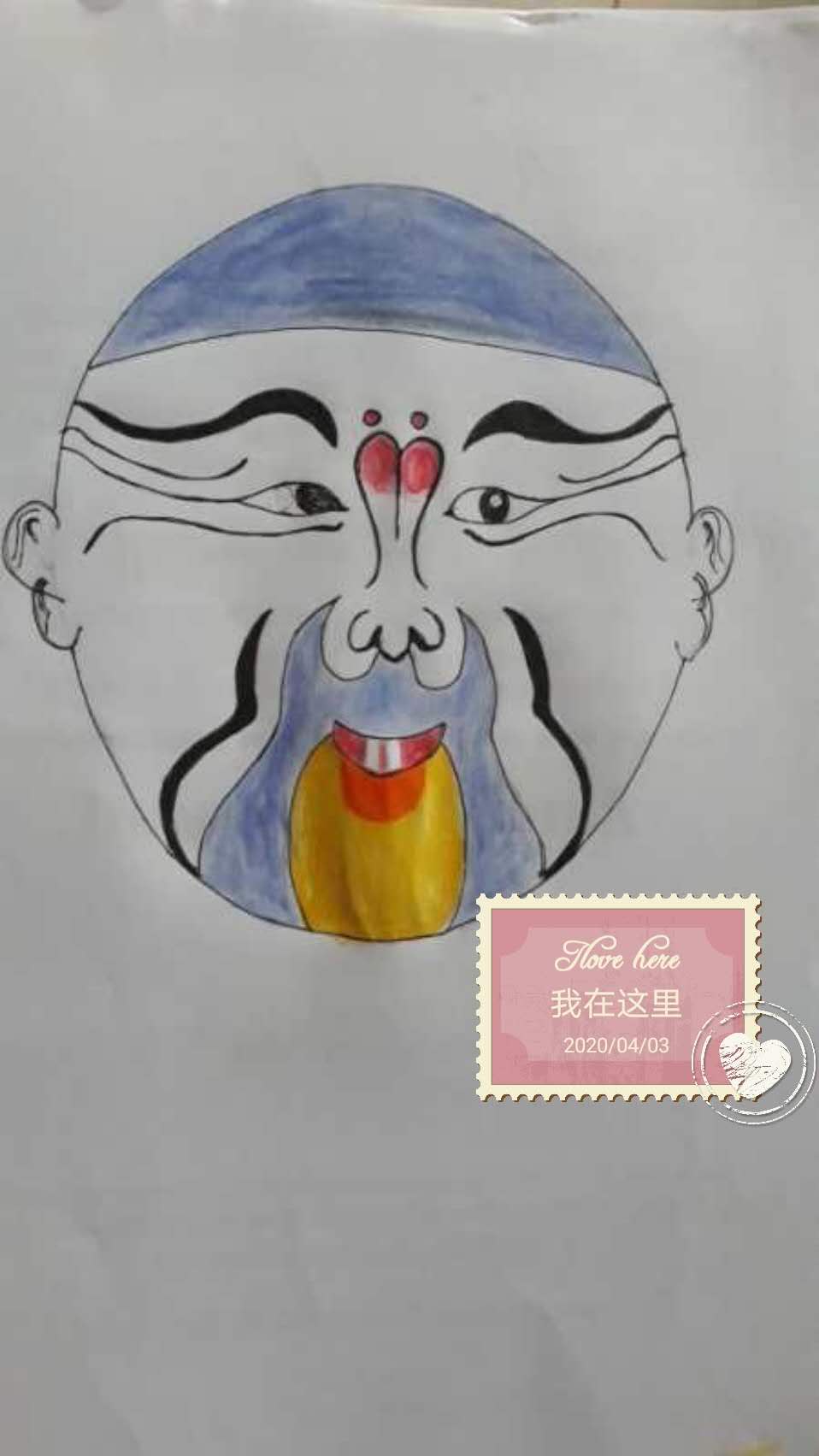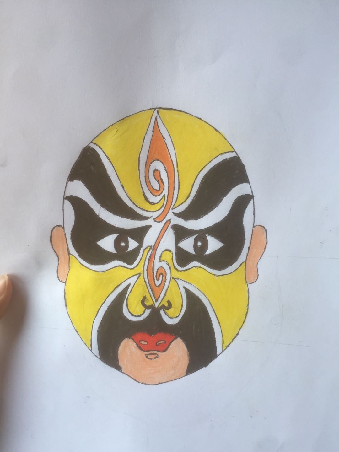 介绍完京剧和京剧脸谱的历史后,段老师边讲边演示京剧脸谱的绘制步骤,并给出三幅样板脸谱,要求学生自己选择其中的一幅进行模仿绘制。