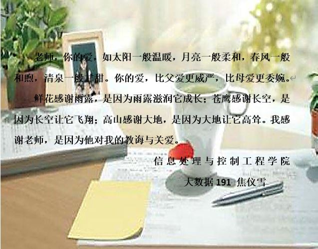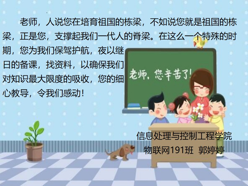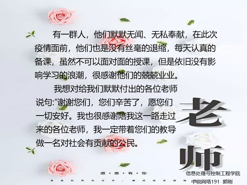 为丰富疫情期间的学习和生活,弘扬中华民族尊师重道传统美德,颂扬教师爱岗敬业、无私奉献的精神,信息处理与控制工程学院组织开展“我的老师”线上征文活动。