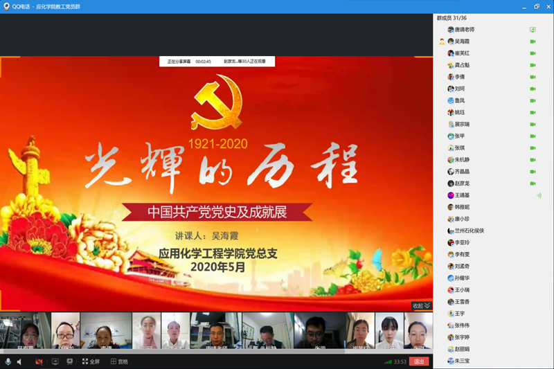 5月8日晚,应用化学工程学院党总支开展“光辉的历程”线上专题党课教育活动。全体教工党员参加了党课学习,此次专题党课由党总支书记吴海霞主讲。