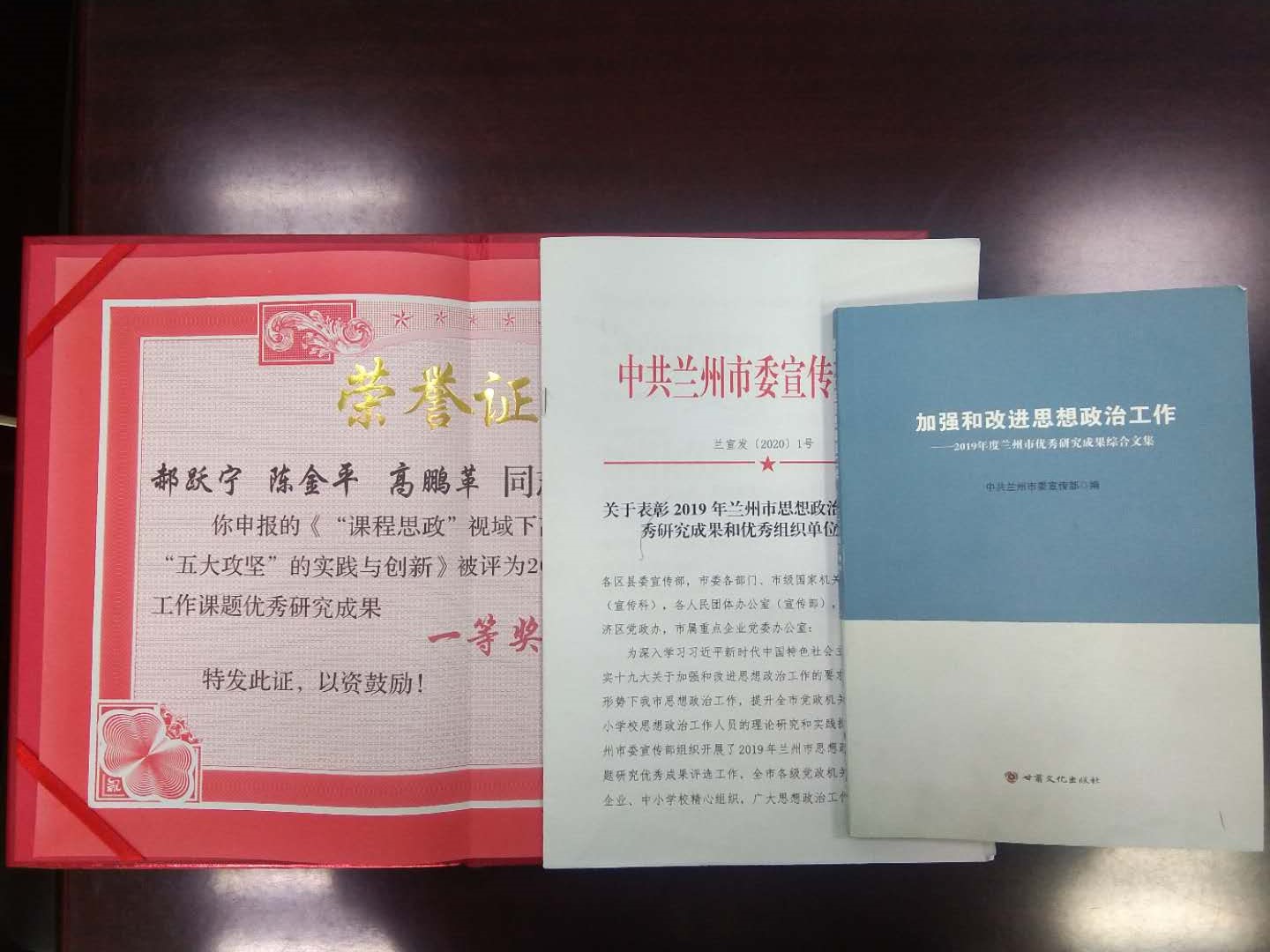 近日,兰州市委宣传部印发文件《关于表彰2019年兰州市思想政治工作课题优秀研究成果和优秀组织单位的通知》(兰宣发〔2020〕1号),公布了兰州市思想政治工作课题优秀研究成果评审结果。本次评选共有300余份课题研究成果参评,经过专家评审,评选出兰州市思想政治工作课题优秀研究成果一等奖20项、二等奖30项、三等奖60项。我校马克思主义学院郝跃宁、陈金平、高鹏革团队与兰州市西固区科学技术局合作完成的科研成果“‘课程思政’视域下高职院校思想政治教育教学‘五大攻坚’的实践与创新”获兰州市思想政治工作课题优秀研究成果一等奖,并由甘肃省政研会推荐报送至中国政研会作为决策参考。