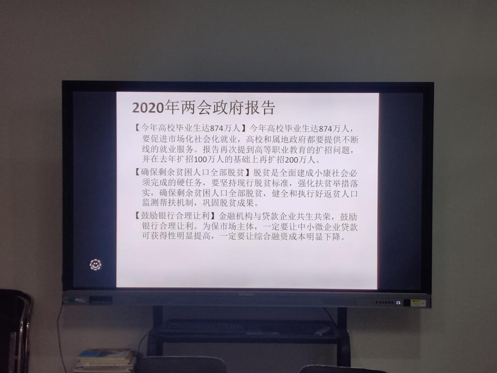 随后一同学习了2020年《政府工作报告》中有关教育领域的内容:在“围绕保障和改善民生,推动社会事业改革发展”部分提出——推动教育公平发展和质量提升;有序组织中小学教育教学和中高考工作;加强乡镇寄宿制学校和县城学校建设,办好特殊教育、继续教育,支持和规范民办教育,帮助民办幼儿园纾困;推进一流大学和一流学科建设;扩大高校面向农村和贫困地区招生规模;要优化投入结构,让教育资源惠及所有家庭和孩子,让他们有更光明未来;在“加大宏观政策实施力度,着力稳企业保就业”部分提出——今年高校毕业生达874万人,要促进市场化社会化就业,高校和属地政府都要提供不断线的就业服务;资助以训稳岗,今明两年职业技能培训3500万人次以上,高职院校扩招200万人,要使更多劳动者长技能、好就业。