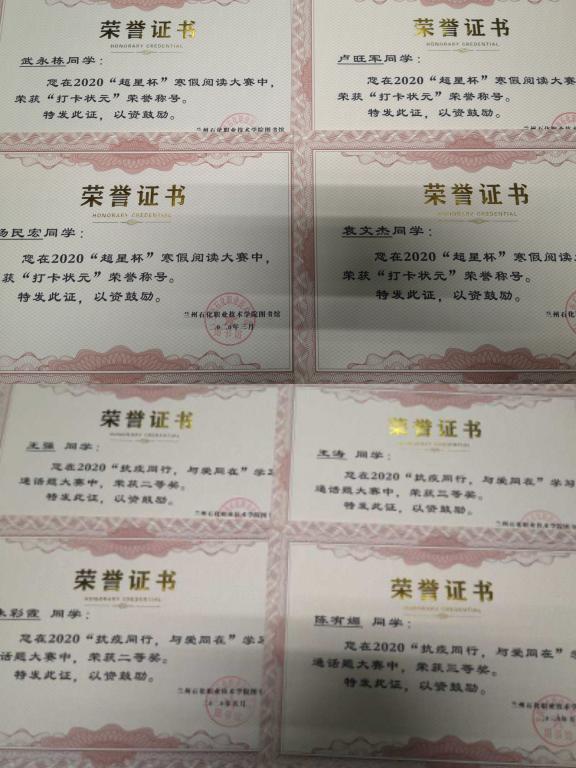 今年4—5月,由于疫情防控需要,我校大部分学生未能返校,大家在家中纷纷报名参加了“读书月”活动之一——甘肃省高校“超星杯”寒假阅读打卡大赛。据活动结束后统计,今年这项比赛全省共有34所高校参加,总参与人数5666人,我校报名人数141人(不包含未认证学生),排名全省第14名,总阅读时长5438小时,121人参与每日打卡读书,获奖人数达38人,名列全省各参赛高校第一。