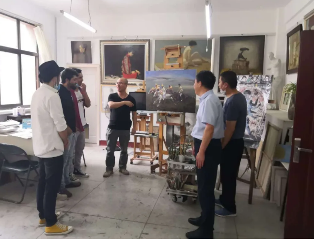 期间,毛小铁馆长为大家讲述了中国国画所蕴含的精神内涵,文化馆副研究馆员王立春和大家交流了油画的绘画技巧;中国书法家协会会员、金城书画院院长杨俏童指导留学生现场写毛笔字,留学生深受中国书法魅力的影响,挥笔写下了“中巴友谊”四个大字;巴基斯坦留学生还为文化馆排练舞蹈的爱好者们展示了热情的巴基斯坦舞蹈。