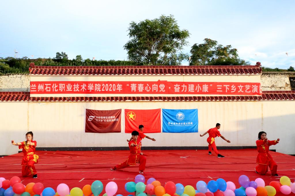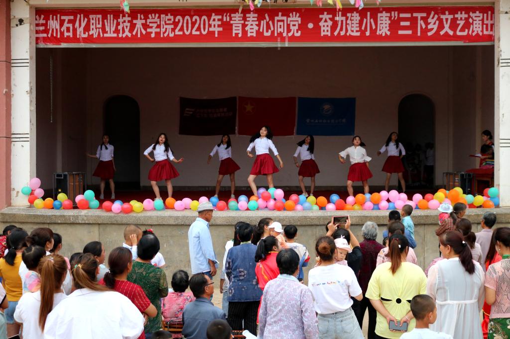 文化盛宴送到群众心坎上。灯火璀璨,掌声不断,龙狮协会以一袭亮眼的“中国红”配合气势恢宏的龙狮开场,在整齐划一、干脆利落的鼓声渲染下,观众的情绪就此“引爆”,随鼓舞飞扬。大学生艺术团带来的《热火》紧随其后,高难度的抛接、跳跃,演绎青春奔放之美感;大众广场舞《跳吧·跳吧》、街舞《火红的玫瑰》、中华武术《中国功夫》,“我的中华,你是炎黄子孙心底里永远的牵挂...”配乐诗朗诵《我和我的祖国》,表达了广大青年大学生对祖国的无限热爱和赞美之情,荡气回肠,震撼心灵;舞蹈“青春”、“康巴汉子”热情奔放,活力四射,倾情演绎了青春的动感和力量;歌曲串烧《九儿》、《我们都是追梦人》表达了青年学子对未来美好的憧憬和不畏艰难锲而不舍的坚定信念;民族舞《雪域高原》委婉中带着刚劲,细腻中饱含着激情。筑梦舞团一曲轻柔曼妙的《水之舞》营造出烟雾缭绕、水流潺潺的舞台氛围,充分展现了我校大学生的青春风采和校园生活的多姿多彩,演出现场人声鼎沸,村民兴致高昂和同学们积极互动。队员们为小朋友们送上了精美的礼品,小朋友拿着队员们送的水杯、小凳子、书包、铅笔盒、水彩笔、字画等礼物,露出了一张张可爱的笑脸,大家纷纷拿出手机拍照、录像,记录精彩时刻。