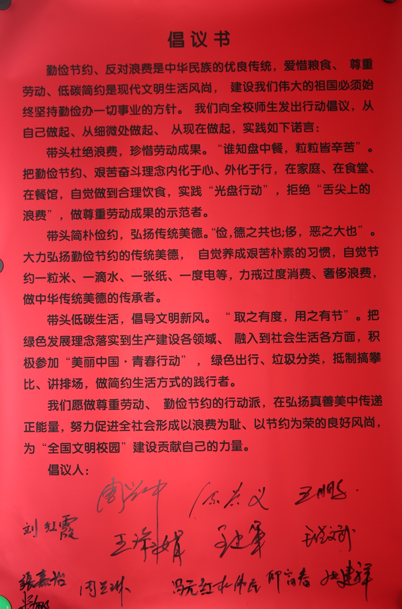 最后,全体党员在“厉行节约、反对浪费”倡议书郑重签字,倡议全校师生养成理性就餐、按需点餐、剩余打包、厉行节约、杜绝浪费的节约用餐习惯,自觉参与“光盘行动”,拒绝舌尖上的浪费,把节俭新风写在生活点滴间,在全校营造浪费可耻、节约为荣的氛围。