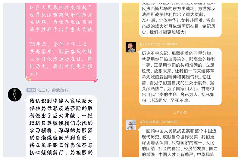 观看仪式后,学生党员在支部群分享了各自的心得体会,大家认识到中国人民以巨大牺牲为世界反法西斯的胜利做出了巨大贡献,一批批抗日英烈是我们永恒的学习榜样,深深的为国家的日渐强盛而感到自豪,纷纷表示将努力学习,提高本领,为祖国的强大和繁荣做出自己应有的贡献。