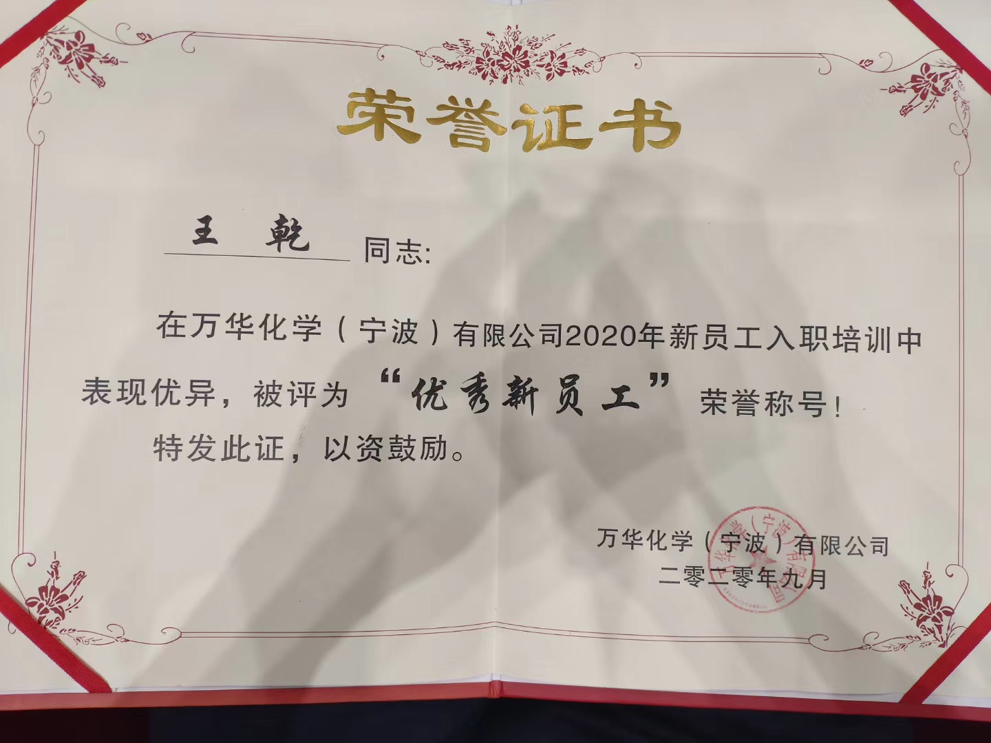 王乾于5月份签约万华化学(宁波)集团股份有限公司,万华化学集团股份有限公司(万华化学)成立于1998年12月20日,在职员工9000(国内6000,国外3000)多人,是山东省第一家先改制后上市的股份制公司。他到企业之后迅速调整状态,树立明确的目标,做事仔细认真,工作中勤于学习、恪尽职守,兢兢业业的态度得到大家的赞赏。在新员工培训期间认真学习每节培训课程,理解企业文化,使命愿景,在新员工培训考试中成绩优异,表现良好。