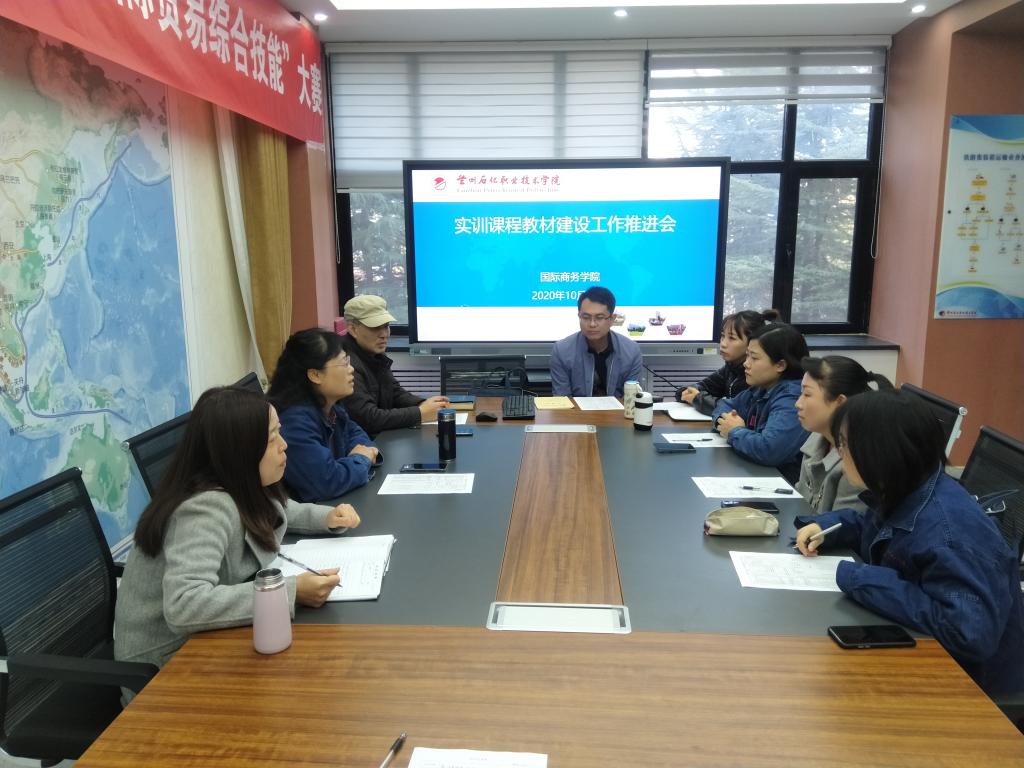 10月28日上午,国际商务学院教材建设推进会在院办召开,会上进一步明确了建设任务和要求,力争2021年底完成全部实训课程教材的建设任务。会上,学院院长提出,大家要高度重视教材建设工作,从实用和实际出发,依据人才培养能力建设需要,细化夯实实训课程教学内容,创新教学方法和模式,采取手册式或活页式组织教材的编写工作。