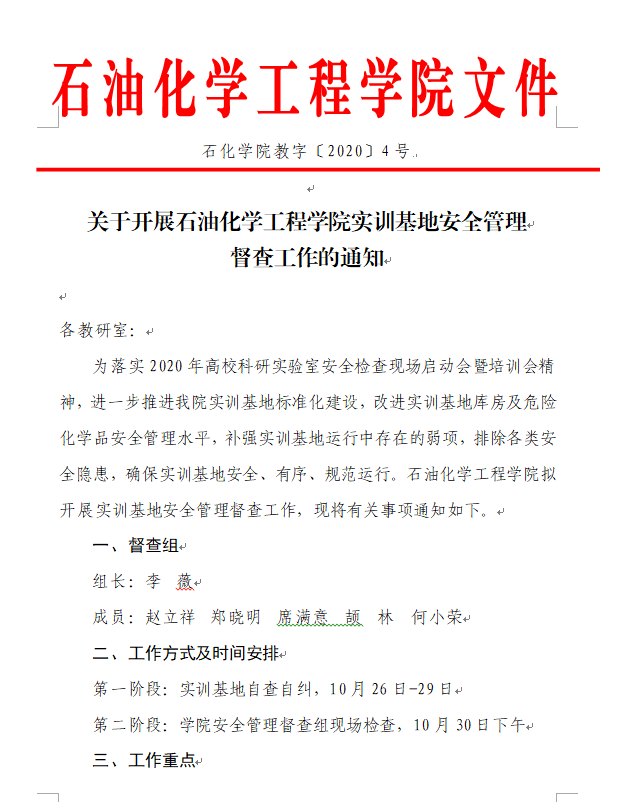 10月30日下午,石油化学工程学院组织开展了实训基地安全管理专项督查工作。
