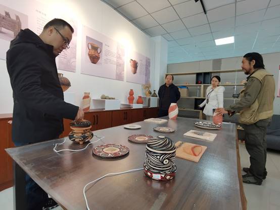 在调研过程中,详细了解了兰职非物质文化遗产学院的大师工作室、现代学徒制订单班、非遗大讲堂等人才培养模式,以及兰职非遗学院的洮砚雕刻艺术、文物修复、剪纸艺术、彩陶艺术、雕刻葫芦艺术、掐丝珐琅壁画等专业场地的建设。同时,在调研过程中与制砚世家马万荣大师、专业教师等进行了详细的交流。