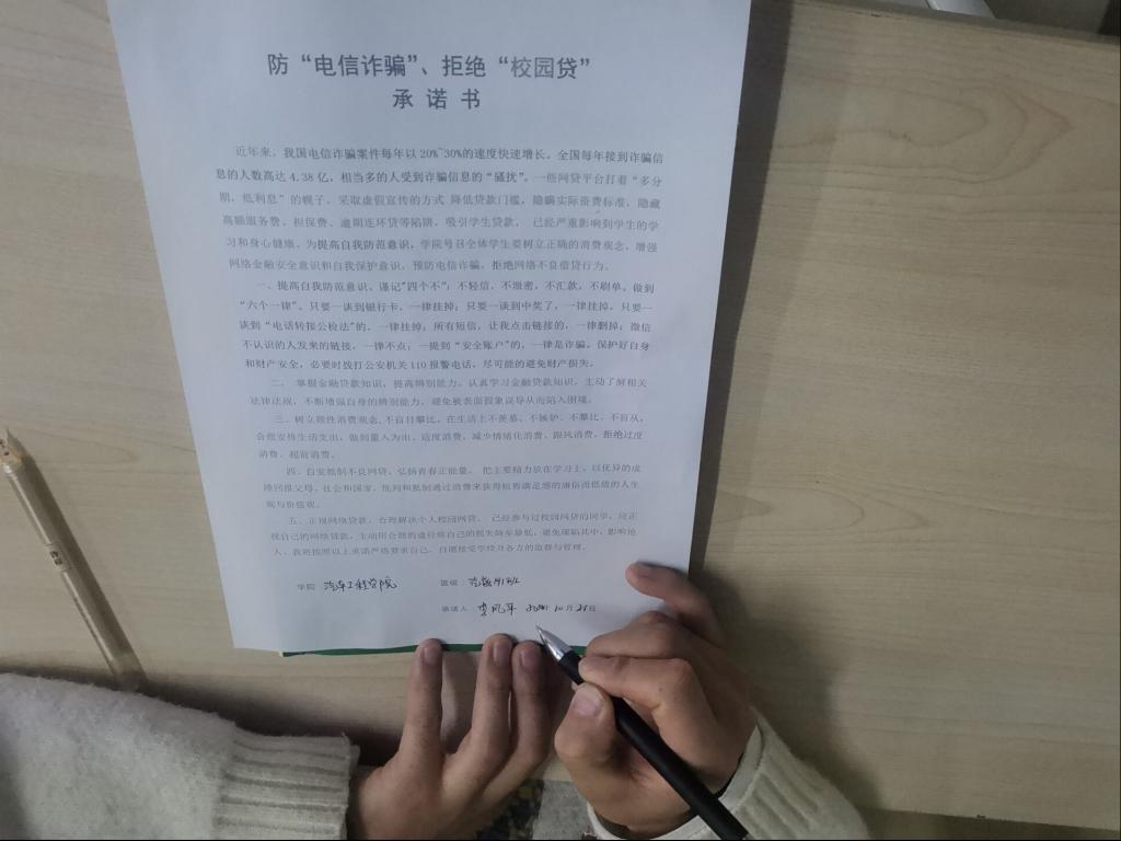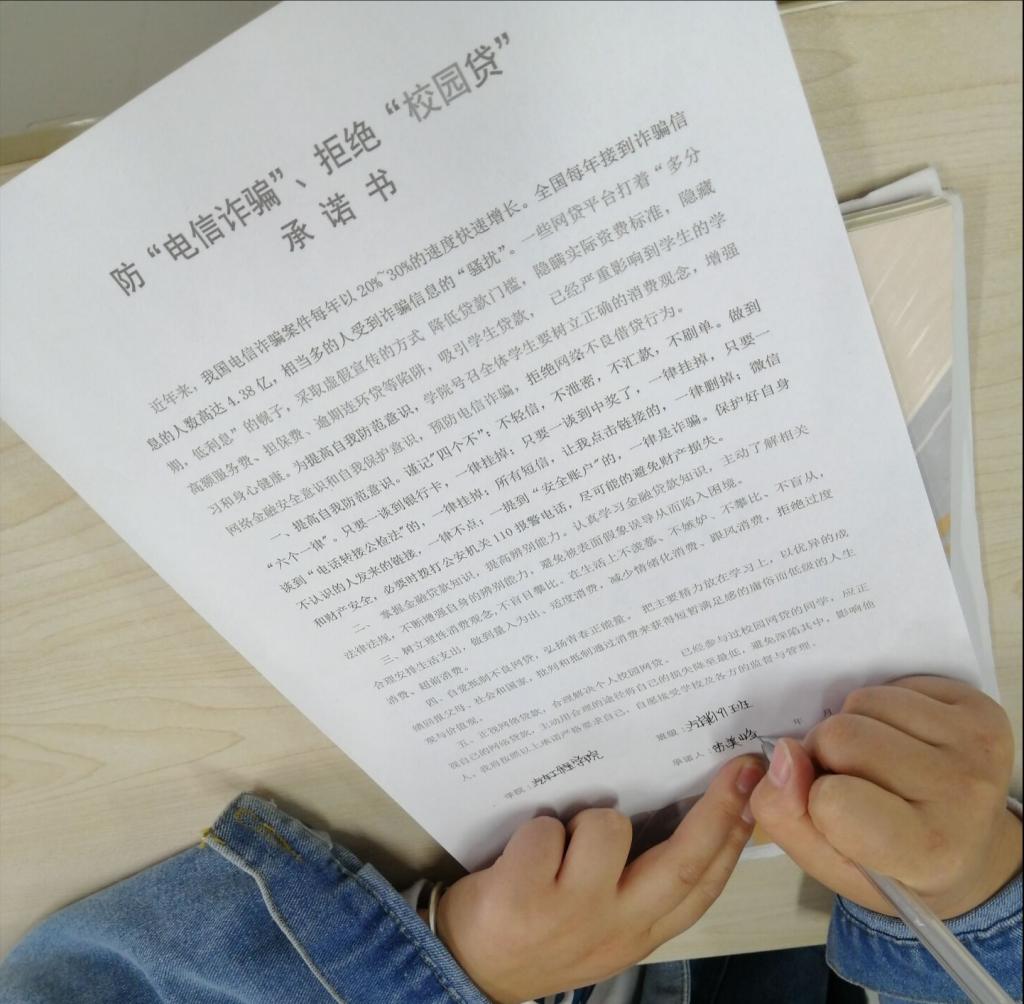 一是精心策划,制定方案。学院高度重视本次宣传教育活动,研究制定了专项活动方案,根据总体安排和部署,结合工作实际,扎实有效地开展各项活动。强化学生自我保护意识,维护自身权益,保护好个人信息,不轻信来历不明的短信、电话。树立理性消费观,根据自身经济状况合理消费,拒绝过度消费、超前消费,提高对金融诈骗和不良借贷的防范意识。二是各班召开“防电信诈骗,拒绝校园贷”主题班会。班主任为师生讲解电信网络诈骗的形式、手段、特点,校园网贷的危害以及必要的防范技能。会后,各班学生签订了“防电信诈骗,拒绝校园贷”承诺书。三是广泛宣传,营造氛围。在校园内悬挂横幅引起学生关注,利用网络推送反诈防骗宣传知识及典型案例,覆盖学生公寓、教学楼等人员密集场所,不断推进反诈防骗教育进校园、进教室、进寝室、入人心。