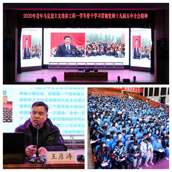 王彦涛从大会概况、重要成果、要义解读、学习贯彻建议等十个方面传达了党的十九届五中全会的主要内容,并对大会要义进行了重点解读。他说:党的十九届五中全会是在全面建成小康社会胜利在望、即将开启全面建设社会主义现代化国家新征程的历史交汇点上召开的一次具有里程碑意义的重要会议,学习宣传全会精神,学生干部要先学一步,学深一层,要全面领会中央精神,通过学习,激发学生的奋斗精神。