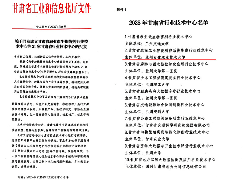 近日,学校“甘肃省流程工业智能测控系统集成行业技术中心”正式获甘肃省工业和信息化厅批复。这标志着学校在服务区域产业转型、推动智能测控技术发展方面迈出关键一步,实现省级行业技术平台建设的新突破。