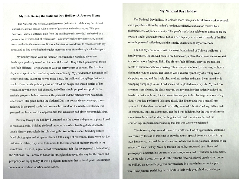此次征文比赛中,同学们围绕国庆假期的亲身经历展开创作,内容丰富多样,情感真挚动人。有的同学以细腻的笔触记录了与家人团聚的温馨时光;有的同学分享了假期外出旅行的所见所闻,展现了祖国各地的壮丽风光与独特风土人情;还有的同学讲述了自己在假期参与志愿活动的成长故事,传递出积极向上的青春正能量。每一篇作品都以独特的视角诠释了国庆假期的意义,充分展现了学生良好的英语语言运用能力和丰富的精神生活。