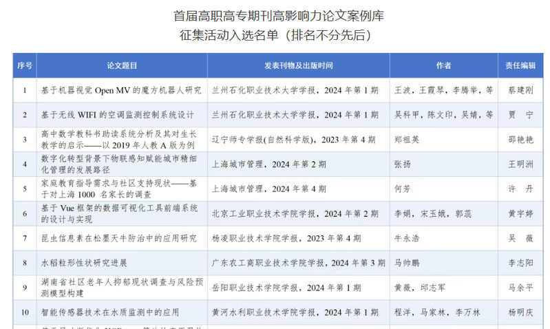 为提升高职高专期刊的核心竞争力,促进期刊坚持以内容建设为根本,在加强内容生产、原创生产上下更大功夫,努力打造出更多的高影响力论文,加快高职高专期刊高质量发展。2025年3月,中国高校科技期刊研究会开展了首届高职高专期刊高影响力论文案例库征集活动,征集活动得到了广泛关注与积极响应。