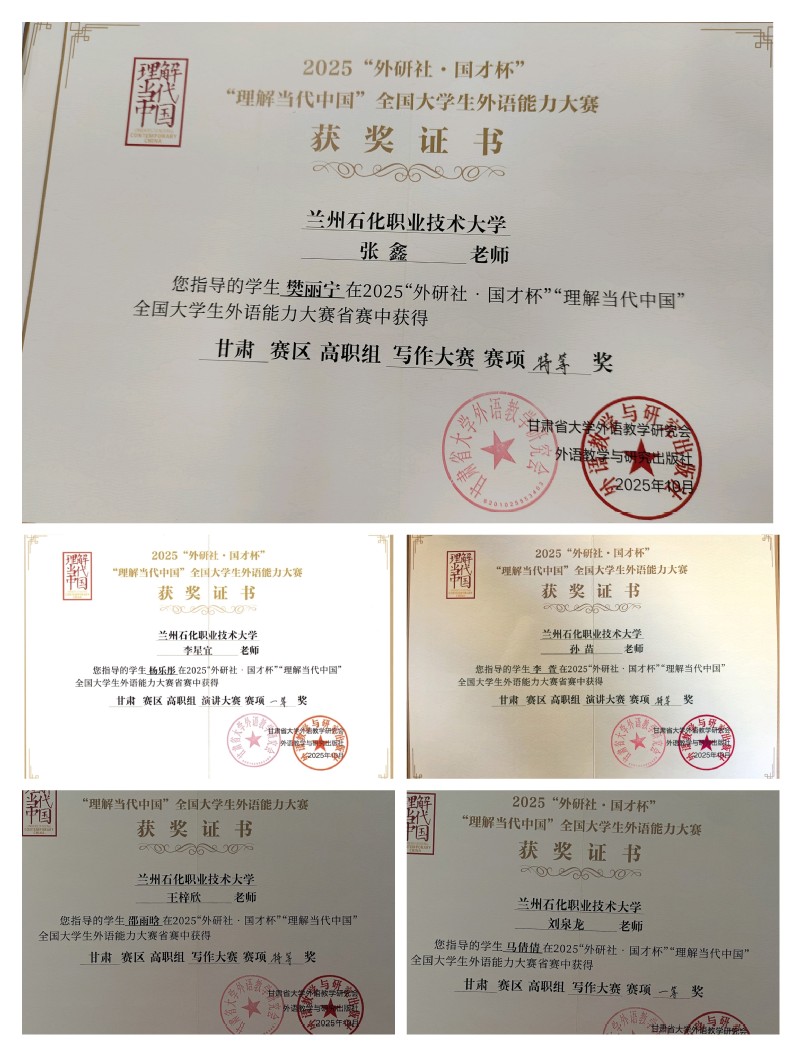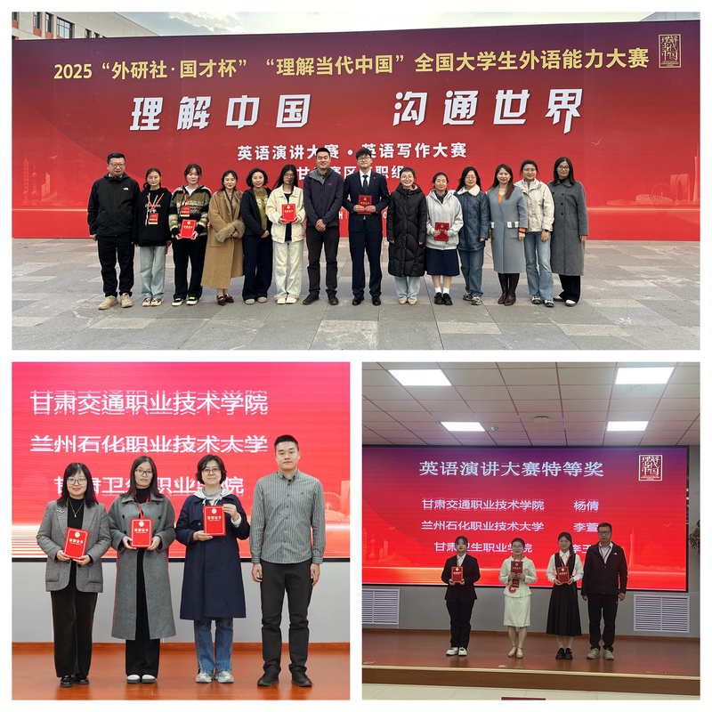 10月26日,2025“外研社・国才杯”“理解当代中国”全国大学生外语能力大赛(高职组)甘肃赛区复赛于甘肃交通职业技术学院圆满落幕。本次赛事汇聚全省13所高职院校的70余名选手,我校选派的6名选手在演讲、写作两个赛项中表现突出,共斩获特等奖3项、一等奖3项,学校荣获“优秀组织奖”。