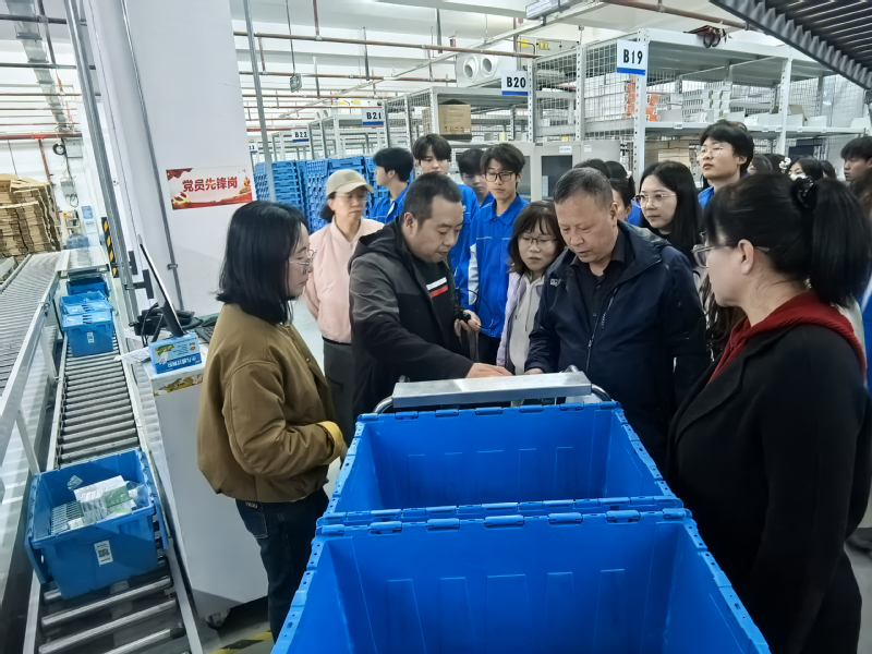 随后,师生一行前往京东物流兰州新区智能产业园。作为西北地区重要的物流枢纽,该园区依托京东“亚洲一号”标准建设,融合了自动化分拣系统、智能仓储管理平台和无人化作业设备,展现了现代物流科技的高效与精准。在入职京东物流优秀学长的引导下,师生们观摩了包裹自动分拣线,直观感受到“智慧物流”如何提升供应链效率。京东物流相关负责人表示,“我们欢迎石化学子走进企业,通过实习实践了解真实的工作场景,也期待与贵校共同培养具备创新思维和实操能力的复合型物流人才。”