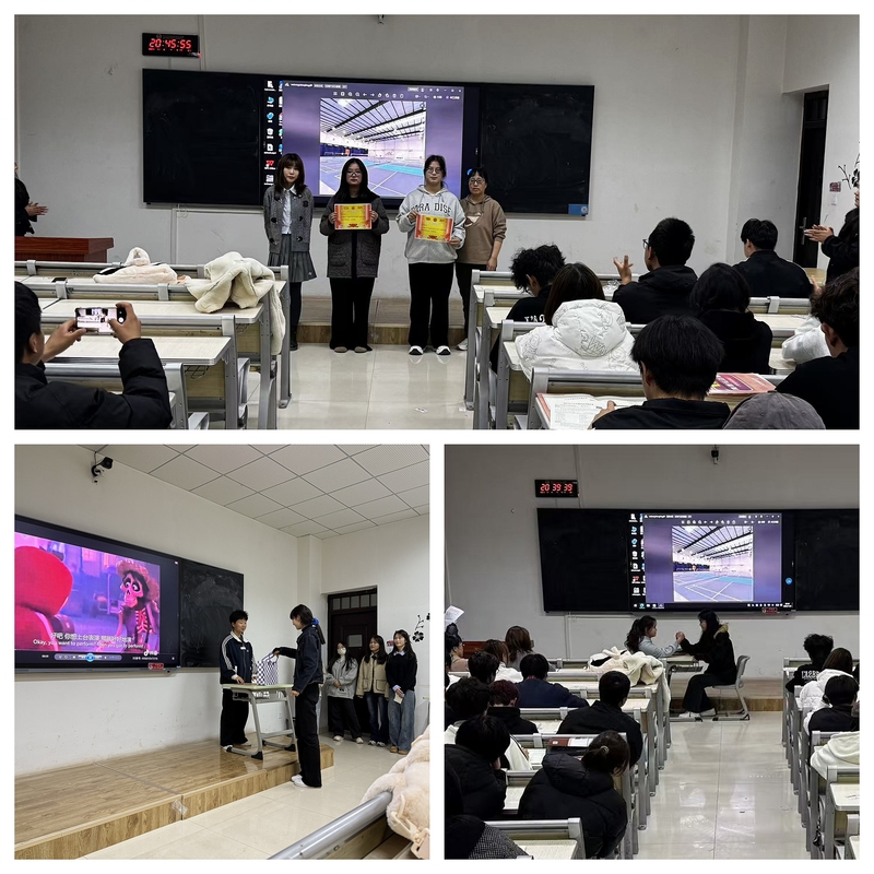 活动现场,6 支参赛队伍围绕多元主题展开创意演绎。从经典文学名著片段的复刻,到跨文化交际场景的模拟,再到热点社会议题的情景再现,各队伍凭借生动的肢体语言与默契的团队配合,将角色形象塑造得栩栩如生。嘉宾老师全程认真观摩,在点评环节中,既对各队伍的创意构思、语言流畅度给予高度肯定,也从发音准确性、剧情逻辑完整性等方面提出专业建议。嘉宾老师为获奖队伍颁发荣誉证书,并合影留念。