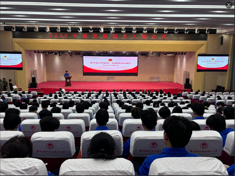 4月8日晚,学校“赓续初心担使命,技能报国启新程”2026年新团员入团仪式在三地四校区同时举行。团委相关负责人、全体新发展团员及优秀团员代表共计800余人齐聚一堂,共同见证了先进青年光荣加入中国共产主义青年团的庄严时刻。