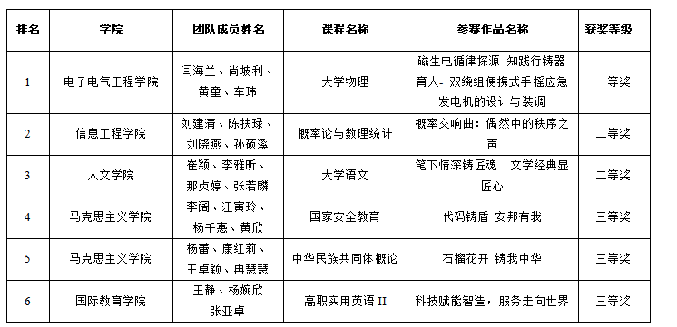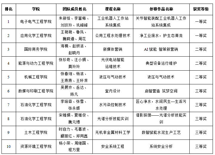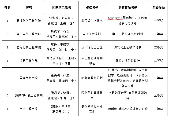 根据《关于举办兰州石化职业技术大学2026年教学能力比赛暨教师教学创新大赛的通知》(兰石化大学校发〔2026〕12号)文件要求,经各教学单位精心组织广大教师积极参赛,学校组织专家通过初赛遴选、决赛评审两轮严格评审,综合评定参赛团队及个人作品质量,现将本次比赛结果予以公示: