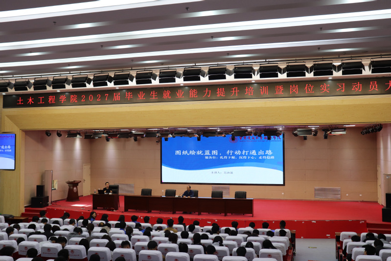 为深入贯彻落实国家“稳就业”“保就业”决策部署,切实提升2027届土木学子就业核心竞争力,引导毕业生以良好状态投身岗位实习、从容应对职场挑战,土木工程学院于4月16日在报告厅举行2027届毕业生就业能力提升培训专题讲座。学院领导班子、班主任、全体辅导员及2027届全体毕业生参加。